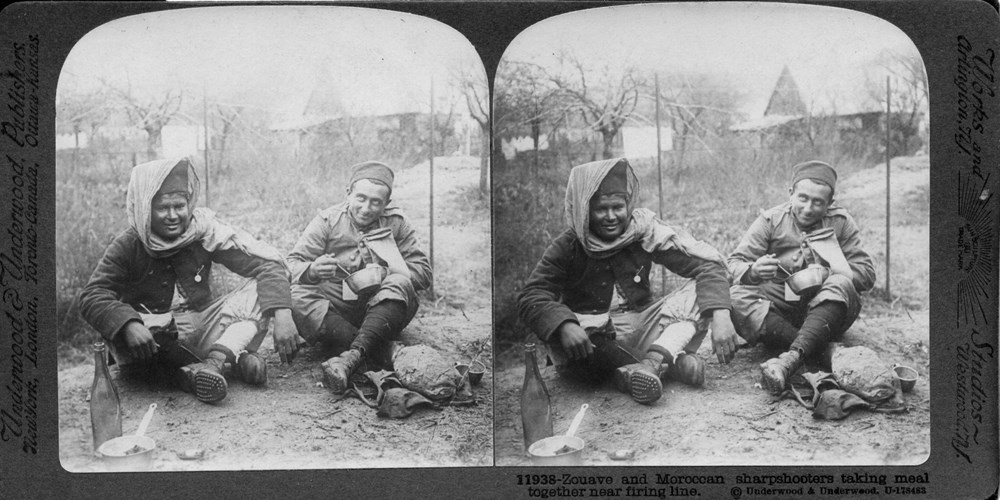 Zouave and Moroccan sharpshooters taking meal together near firing line