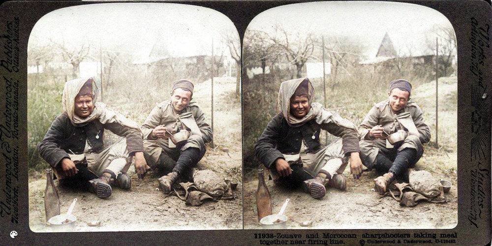 Zouave and Moroccan sharpshooters taking meal together near firing line