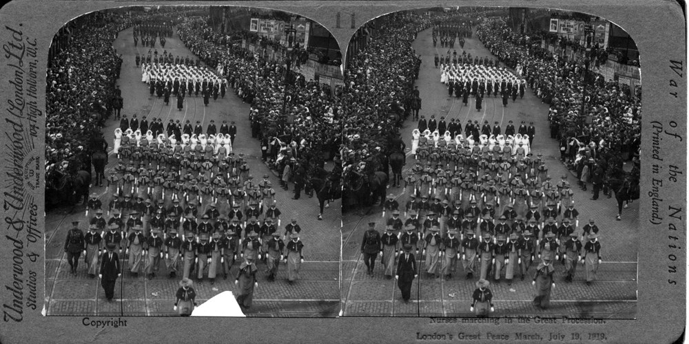 Image Id: 191 Contributor: The Jordan/Ference Collection Theatre: Post-War Subject: Parades Location: London Regiment: Unknown Service Arm: Medical Services Battle: Unknown Date: July 1919 Combatants: British Publisher: Underwood & Underwood Source: British Directory: London Peace March