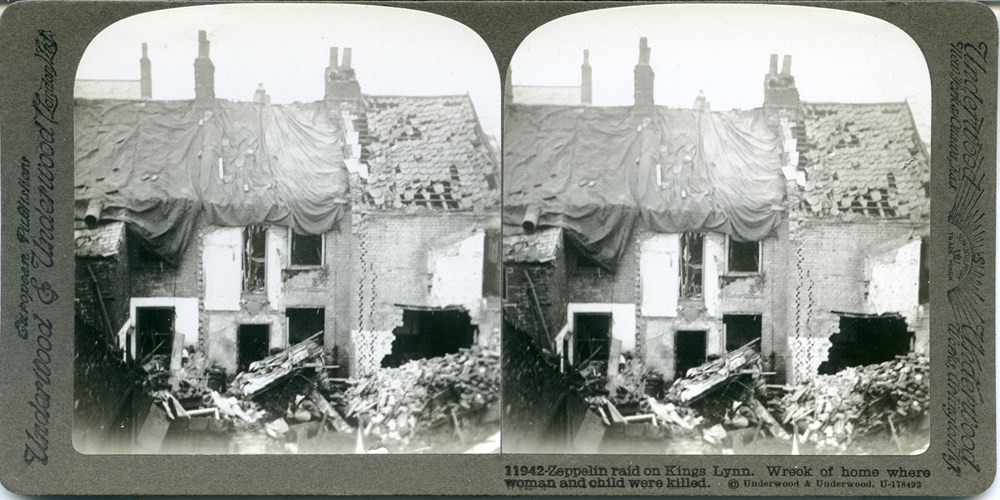 Zeppelin raid on Kings Lynn; wreck of home where woman and child were killed