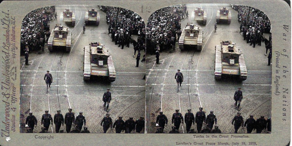 Image Id: 192 Contributor: The Jordan/Ference Collection Theatre: Post-War Subject: Parades Location: London Regiment: Unknown Service Arm: Tanks/Armoured Cars Battle: Unknown Date: July 1919 Combatants: British Publisher: Underwood & Underwood Source: British Directory: London Peace March