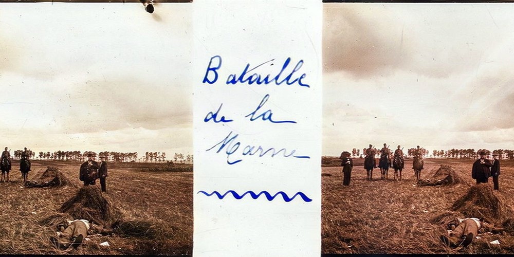 Light leak from right-hand lens. Cavalry needs identification.Image Id: 1929 Contributor: The Jordan/Ference Collection Theatre: Western Front Subject: Battle Aftermath Location: France Regiment: Unknown Service Arm: Unknown Battle: Marne Date: 1914 Combatants: Unknown Publisher: French Photojournalist 1914 Source: French Directory: Set of 43 Webres