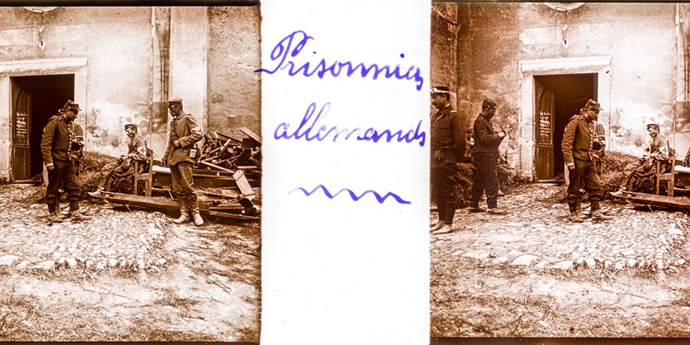 Dodgy caption? Looks more like an aid station. Captions not by photoj? Graffiti on door of building.Image Id: 1951 Contributor: The Jordan/Ference Collection Theatre: Western Front Subject: Prisoners Location: France Regiment: Unknown Service Arm: Unknown Battle: Unknown Date: 1914 Combatants: French/German Publisher: French Photojournalist 1914 Source: French Directory: Set of 43 Webres