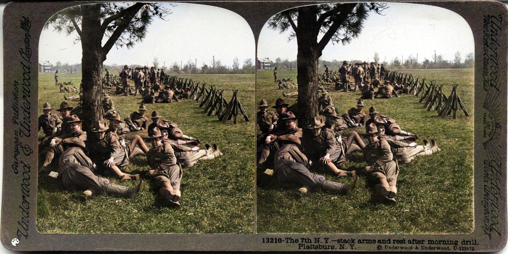 Image Id: 1964 Contributor: The Jordan/Ference Collection Theatre: Home Front Subject: Training Location: Plattsburg, New York, USA Regiment: 7th New York Service Arm: Infantry Battle: Unknown Date: Unknown Combatants: American Publisher: Underwood & Underwood (American) Source: American Directory: 13088-14033