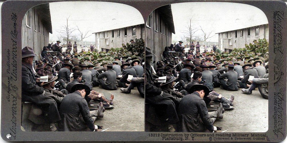 Image Id: 1966 Contributor: The Jordan/Ference Collection Theatre: Home Front Subject: Training Location: Plattsburg, New York, USA Regiment: Unknown Service Arm: Infantry Battle: Unknown Date: Unknown Combatants: American Publisher: Underwood & Underwood (American) Source: American Directory: 13088-14033