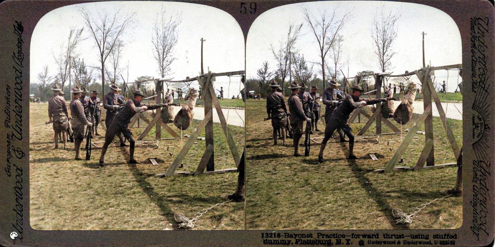 Bayonet practice--forward thrust--using stuffed dummy, Plattsburg, N.Y.