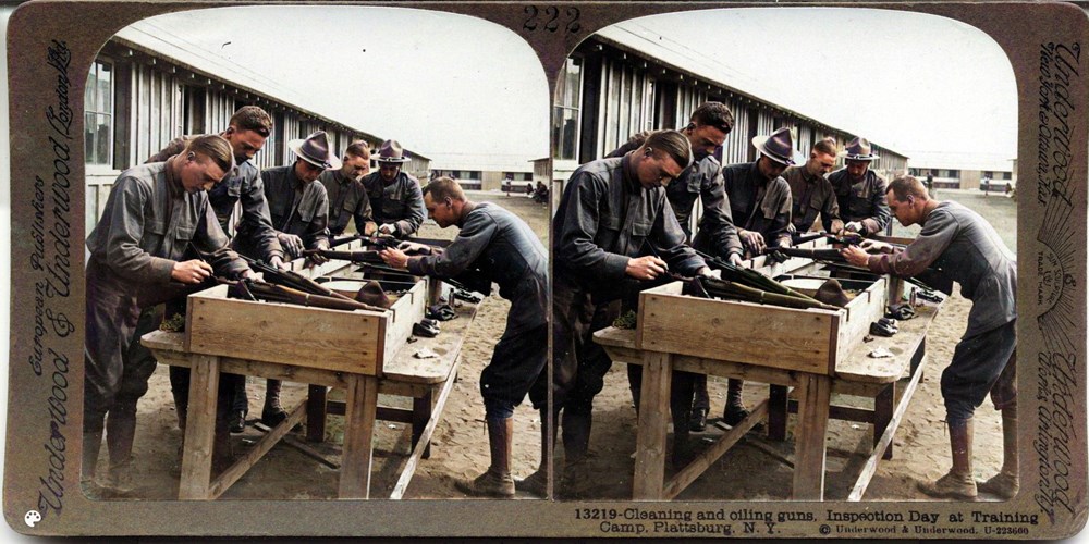 Cleaning and oiling guns. Inspection Day at Training Camp, Plattsburg, N.Y.
