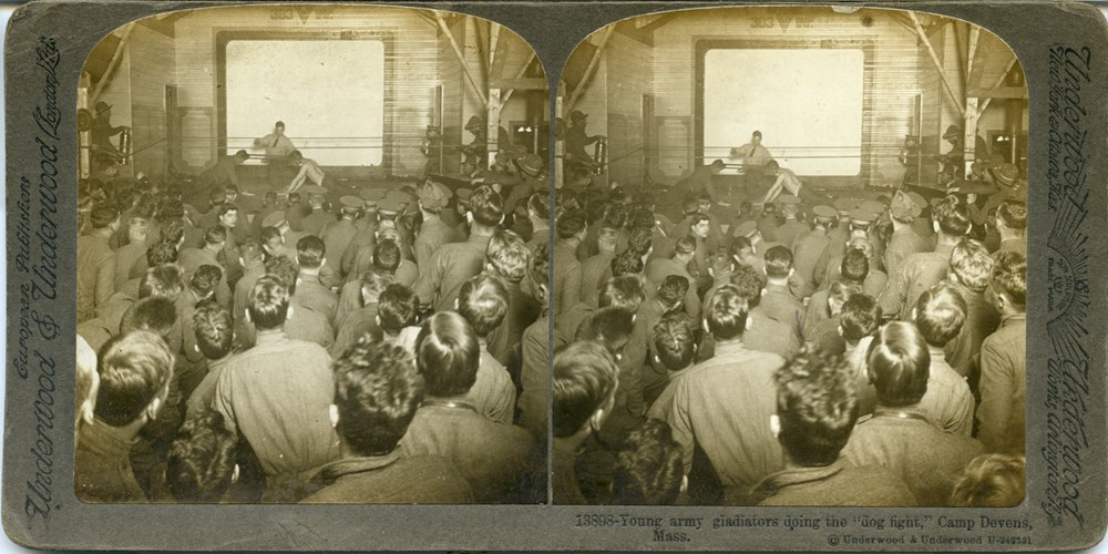 Young army gladiators doing the "dog fight," Camp Devens, Mass.