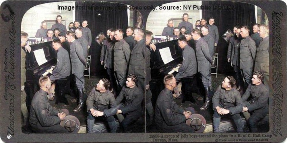 Men singing in the Knights of Columbus Hall, Camp Devens.