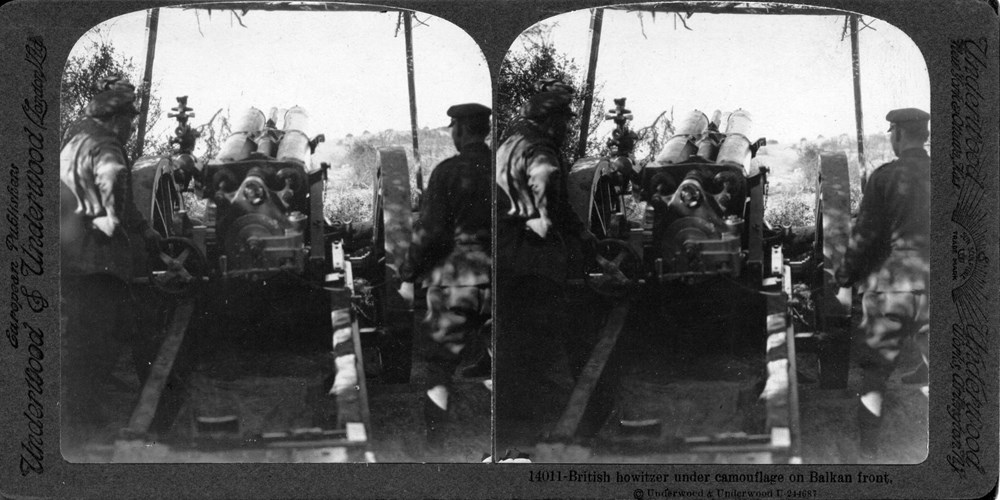 British howitzer under camouflage on Balkan front