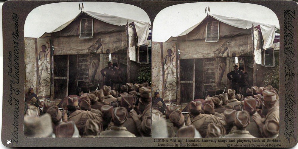 A "Put-up" theater, showing stage and players, back of Serbian trenches in the Balkans