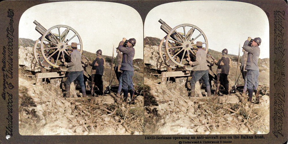 Image Id: 2011 Contributor: The Jordan/Ference Collection Theatre: The Balkans Subject: The Front Line Location: Unknown Regiment: Unknown Service Arm: Anti-Aircraft Artillery Battle: Unknown Date: Unknown Combatants: Serbian Publisher: Underwood & Underwood (American) Source: American Directory: 13088-14033