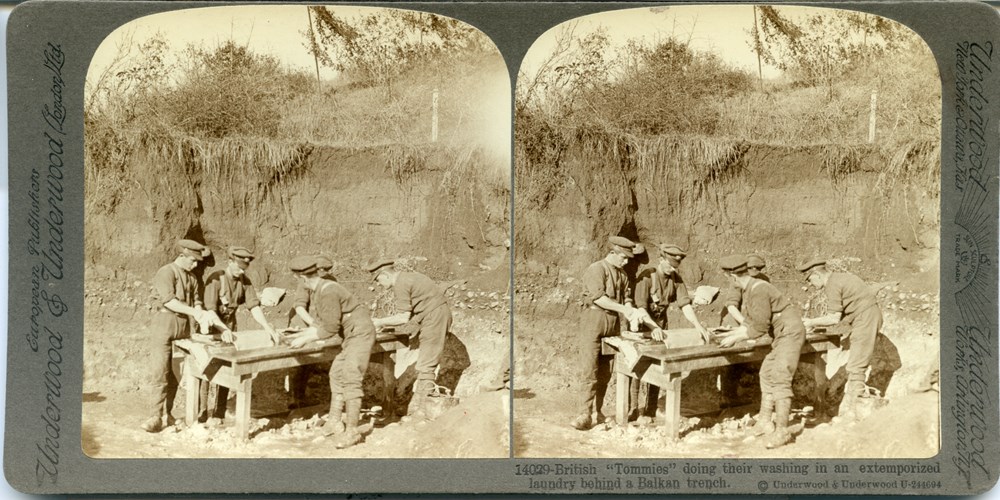 British "Tommies" doing their washing in an extemporized laundry behind a Balkan trench.