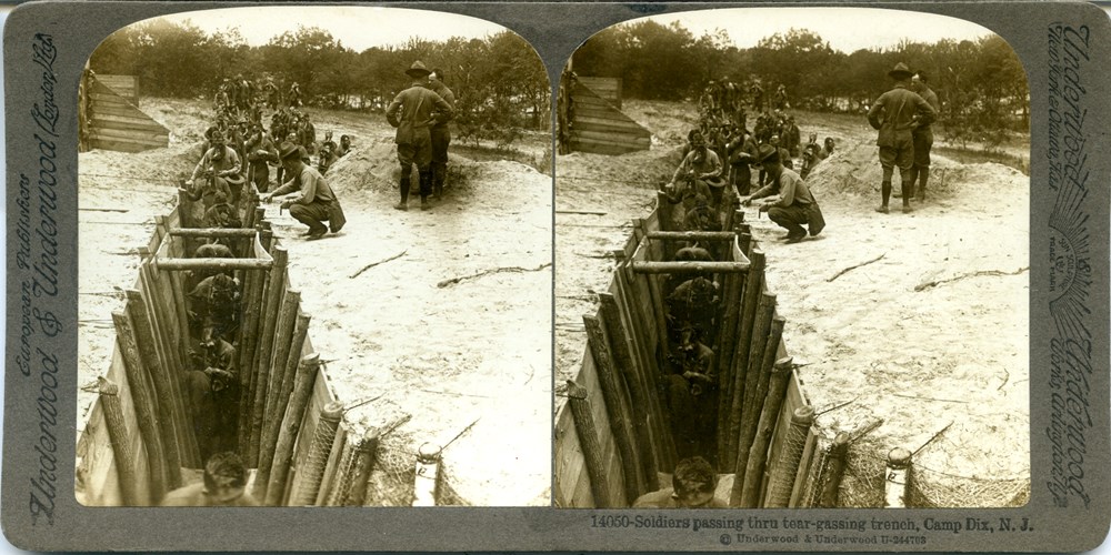 Soldiers passing thru tear-gassing trench, Camp Dix, N.J.