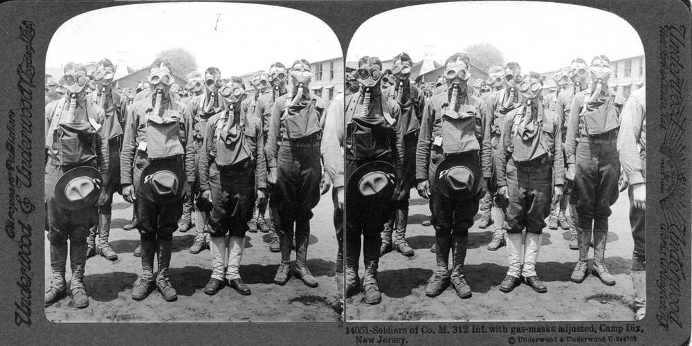 Soldiers of Co. M. 312 Inf. with gas-masks adjusted, Camp Dix, New Jersey