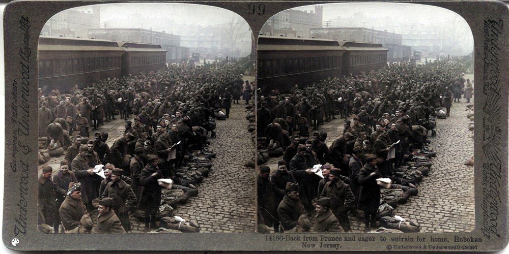 Image Id: 2027 Contributor: The Jordan/Ference Collection Theatre: Home Front Subject: Homecoming Location: Hoboken, New York, USA Regiment: Unknown Service Arm: Infantry Battle: Unknown Date: Unknown Combatants: American Publisher: Underwood & Underwood (American) Source: American Directory: 14044-14325