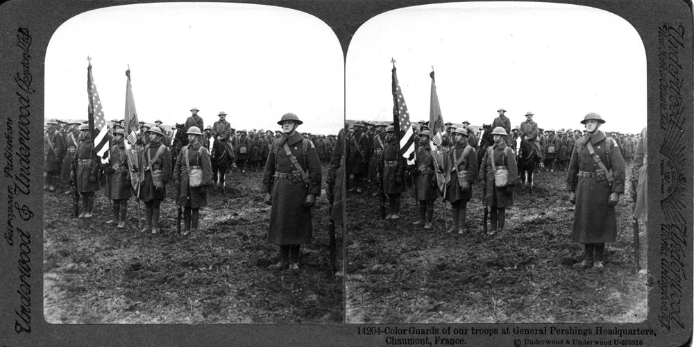 Color Guards of our troops at General Pershings Headquarters, Chaumont, France