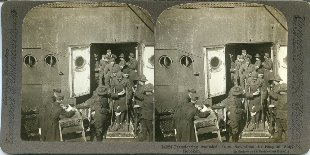 Transferring wounded soldiers from Leviathan to Hospital Ship, Hoboken.