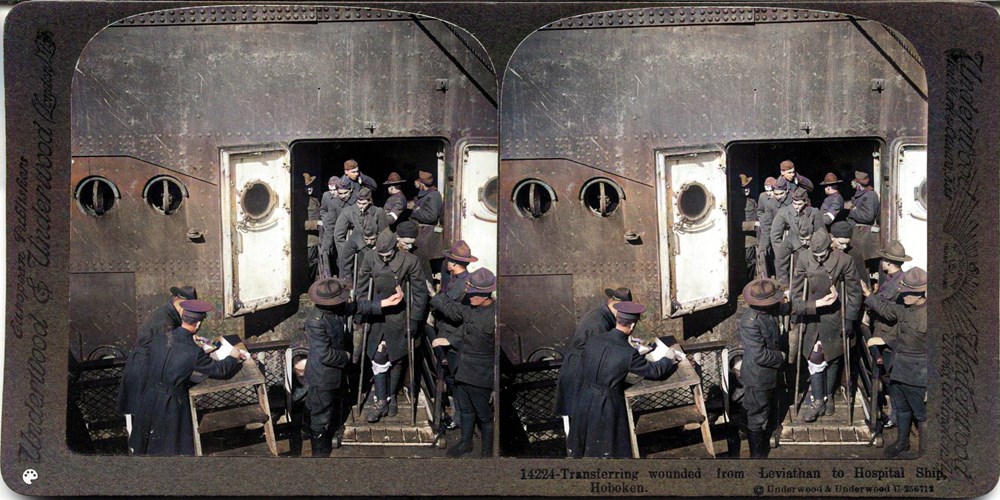 Transferring wounded soldiers from Leviathan to Hospital Ship, Hoboken.
