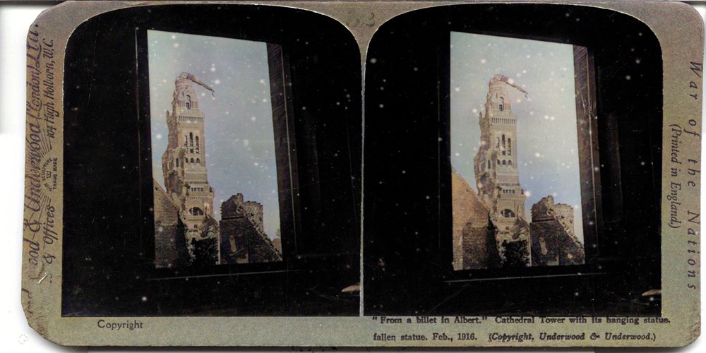 "From a billet in Albert." Cathedral Tower with its hanging statue, fallen statue, Feb, 1916]