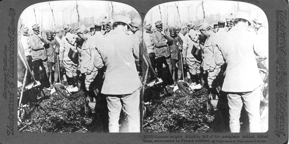 German aviator killed by fall of his aeroplane behind Allied lines, surrounded by French soldiers