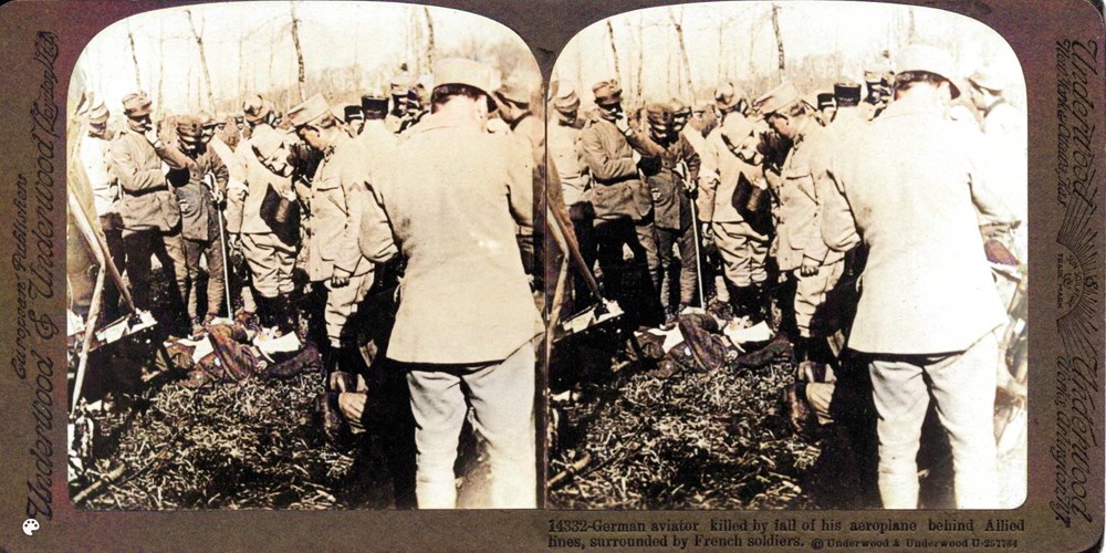 German aviator killed by fall of his aeroplane behind Allied lines, surrounded by French soldiers