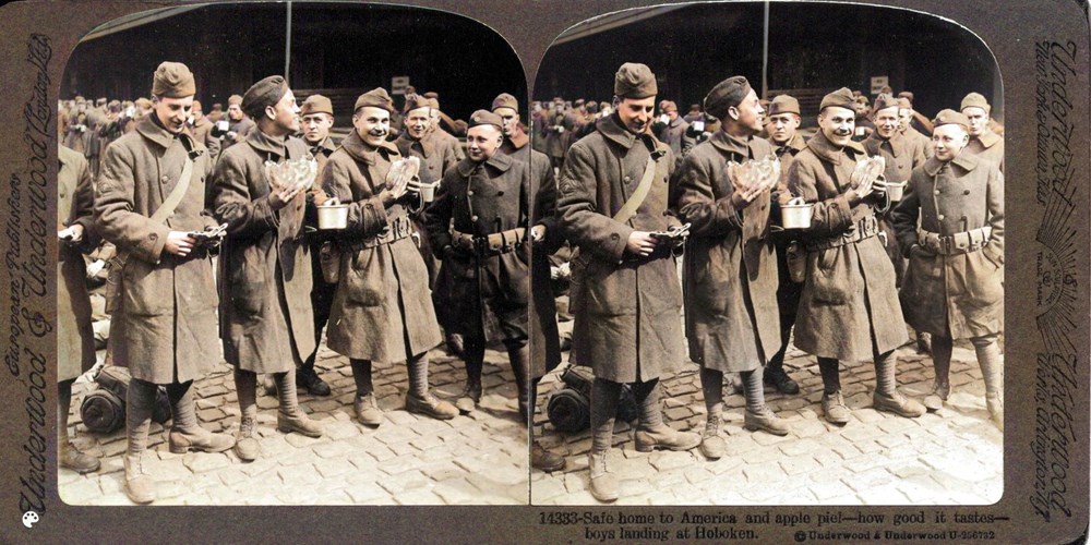 Safe home to America and apple pie!--how good it tastes--boys landing at Hoboken