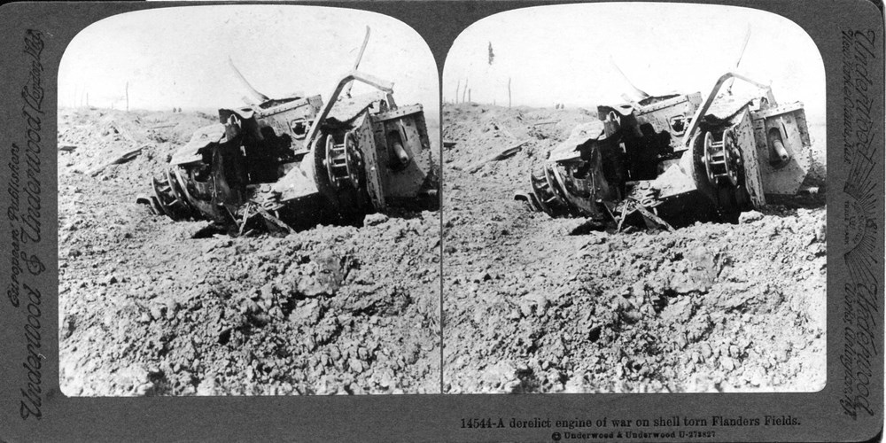 Image Id: 2104 Contributor: The Jordan/Ference Collection Theatre: Western Front Subject: Battle Aftermath Location: Flanders Regiment: Unknown Service Arm: Tanks/Armoured Cars Battle: Unknown Date: Unknown Combatants: British Publisher: Underwood & Underwood (American) Source: American Directory: 14536 Plus