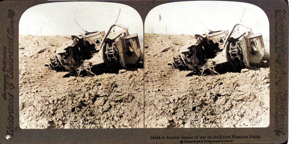 Image Id: 2104 Contributor: The Jordan/Ference Collection Theatre: Western Front Subject: Battle Aftermath Location: Flanders Regiment: Unknown Service Arm: Tanks/Armoured Cars Battle: Unknown Date: Unknown Combatants: British Publisher: Underwood & Underwood (American) Source: American Directory: 14536 Plus