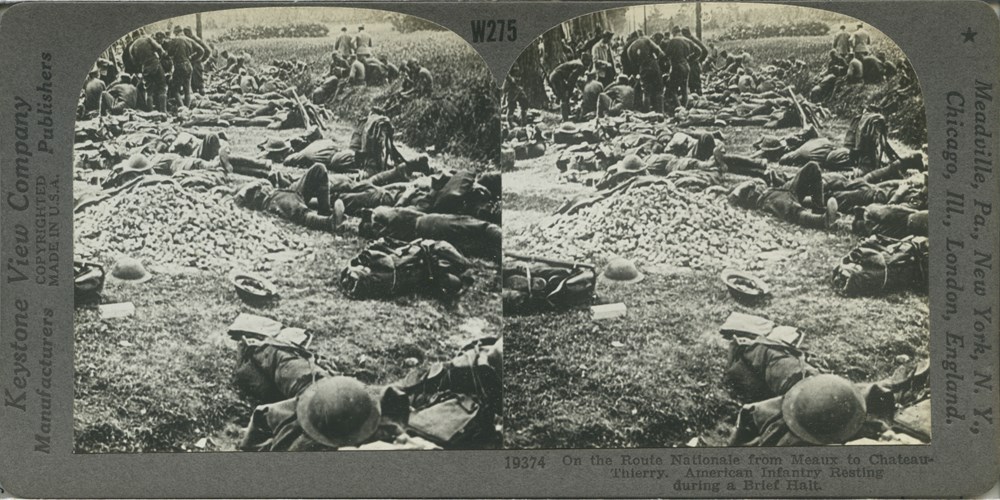 On the Route Nationale from Meaux to Chateau-Thierry. American infantry Resting during a Brief Halt