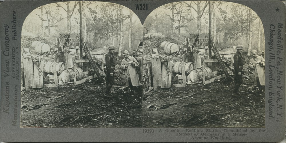 A Gasoline Refilling Station Demolished by the Retreating Germans in a Meuse-Argonne Woodland
