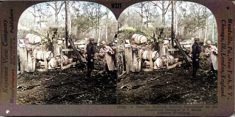 A Gasoline Refilling Station Demolished by the Retreating Germans in a Meuse-Argonne Woodland