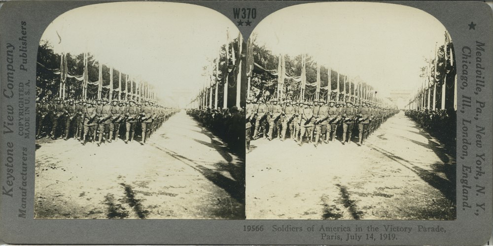 Image Id: 2156 Contributor: The Jordan/Ference Collection Theatre: Post-War Subject: Parades Location: Paris, France Regiment: Unknown Service Arm: Infantry Battle: Victory Parade Date: July 14th 1919 Combatants: American Publisher: Keystone View Co Source: American Directory: 19351-19599