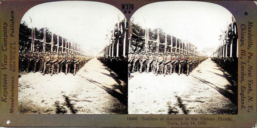 Image Id: 2156 Contributor: The Jordan/Ference Collection Theatre: Post-War Subject: Parades Location: Paris, France Regiment: Unknown Service Arm: Infantry Battle: Victory Parade Date: July 14th 1919 Combatants: American Publisher: Keystone View Co Source: American Directory: 19351-19599