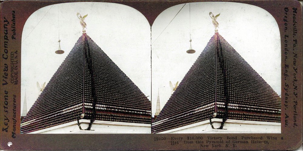 Every $10,000 Victory Bond Purchased Wins a Hat from this Pyramid of German Helmets, N.Y.