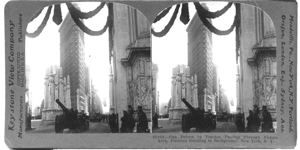 Gun Driven by Tractor, Passing Through Victory Arch, Flatiron Building in Background, New York, N.Y.