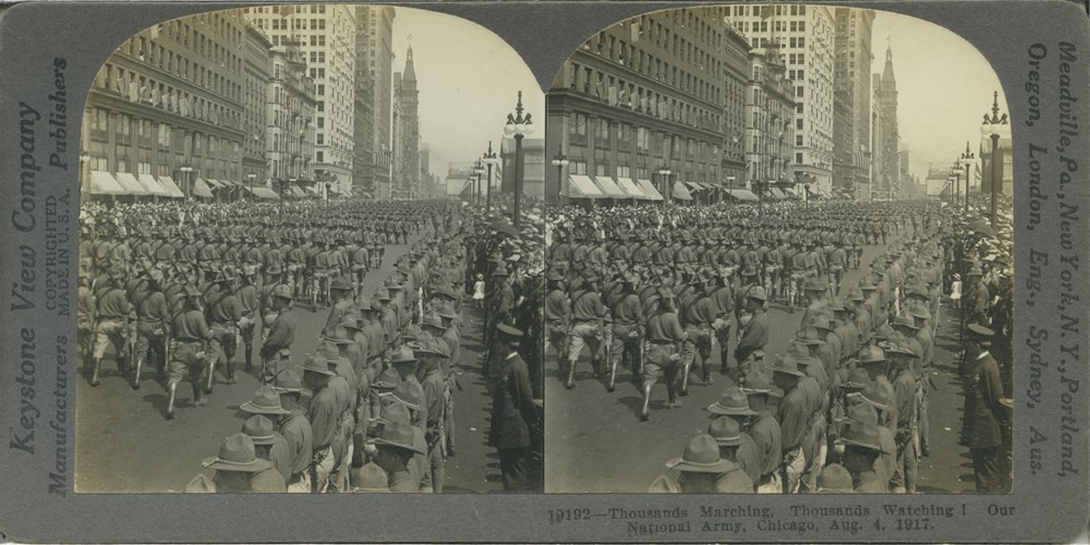 PRESKO 6129 is a different shot at the same locationImage Id: 2245 Contributor: The Jordan/Ference Collection Theatre: Home Front Subject: Parades Location: Chicago USA Regiment: Unknown Service Arm: Infantry Battle: Unknown Date: Unknown Combatants: American Publisher: Keystone View Co Source: American Directory: 19100-19199