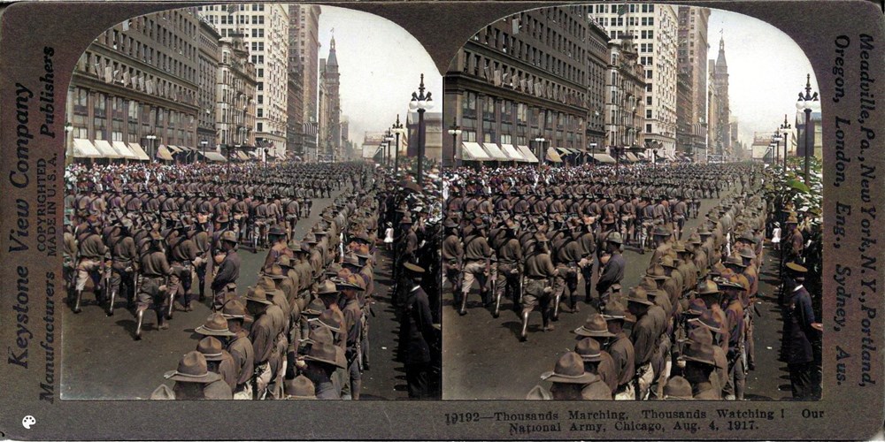 PRESKO 6129 is a different shot at the same locationImage Id: 2245 Contributor: The Jordan/Ference Collection Theatre: Home Front Subject: Parades Location: Chicago USA Regiment: Unknown Service Arm: Infantry Battle: Unknown Date: Unknown Combatants: American Publisher: Keystone View Co Source: American Directory: 19100-19199