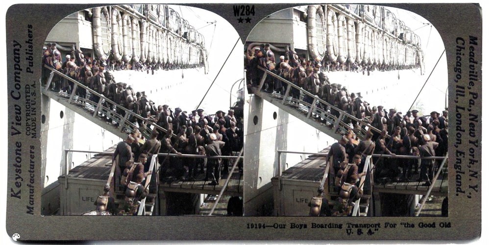 Some versions incorrectly list the transport as heading for France.Some versions incorrectly list the transport as heading for France.Some versions incorrectly list the transport as heading for France.Some versions incorrectly list the transport as headinImage Id: 2247 Contributor: The Jordan/Ference Collection Theatre: Western Front Subject: Homecoming Location: Unknown Regiment: Unknown Service Arm: Infantry Battle: Unknown Date: Unknown Combatants: American Publisher: Keystone View Co Source: American Directory: 19100-19199