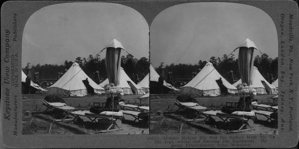 Besides Making His Bed the Soldier Must Tie Up His Tent, Airing and Sunning His Equipment. Hygiene Precautionary Army measures.