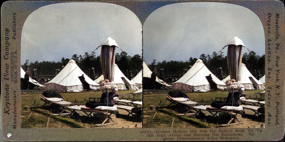 Besides Making His Bed the Soldier Must Tie Up His Tent, Airing and Sunning His Equipment. Hygiene Precautionary Army measures.