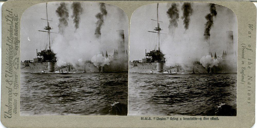Image Id: 227 Contributor: The Jordan/Ference Collection Theatre: The High Seas Subject: Surface Vessels Location: Unknown Regiment: HMS Drake Service Arm: Navy Battle: Unknown Date: Unknown Combatants: British Publisher: Underwood & Underwood Source: British Directory: MISC