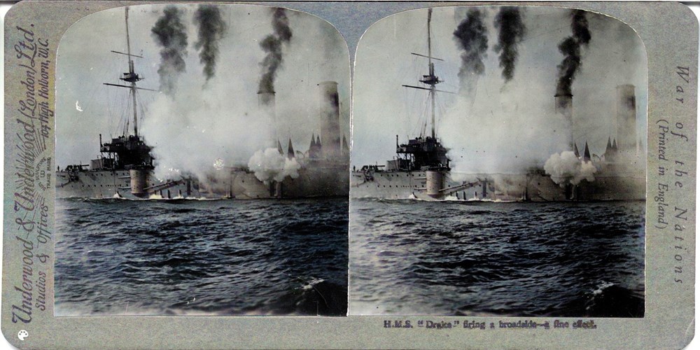 Image Id: 227 Contributor: The Jordan/Ference Collection Theatre: The High Seas Subject: Surface Vessels Location: Unknown Regiment: HMS Drake Service Arm: Navy Battle: Unknown Date: Unknown Combatants: British Publisher: Underwood & Underwood Source: British Directory: MISC