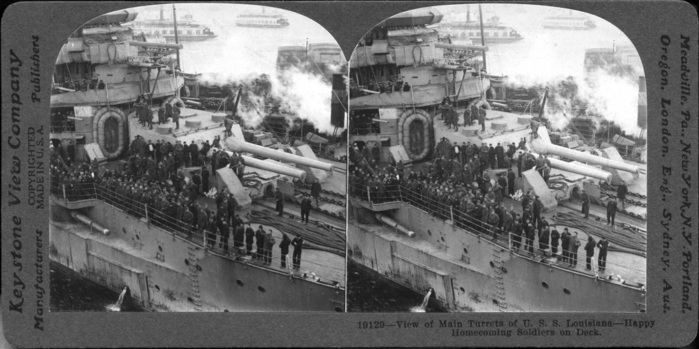 Image Id: 2278 Contributor: The Jordan/Ference Collection Theatre: Home Front Subject: Homecoming Location: New York, USA Regiment: U.S.S. Louisiana Service Arm: Infantry Battle: Unknown Date: Unknown Combatants: American Publisher: Keystone View Co Source: American Directory: 19100-19199