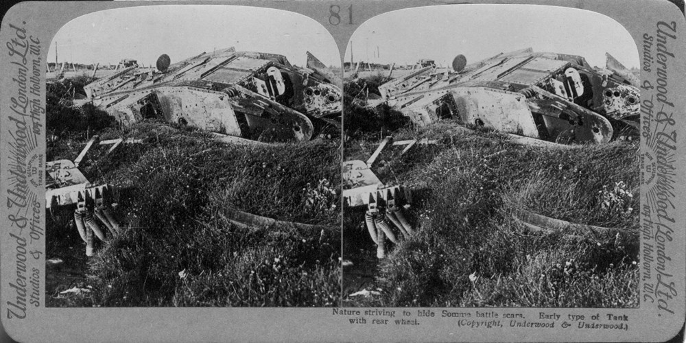 Nature striving to hide Somme battle scars. Early type of Tank with rear wheels