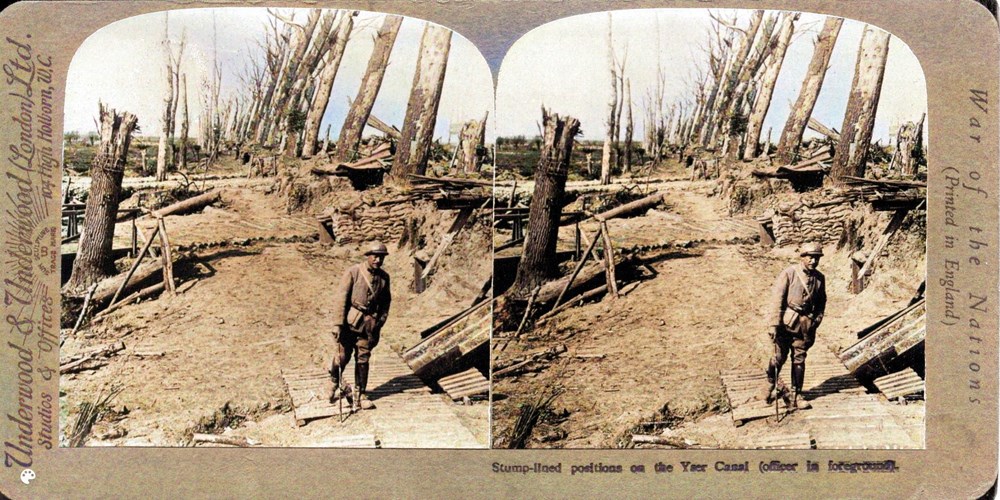 Stump-lined positions on the Yser Canal (officer in foregraound)