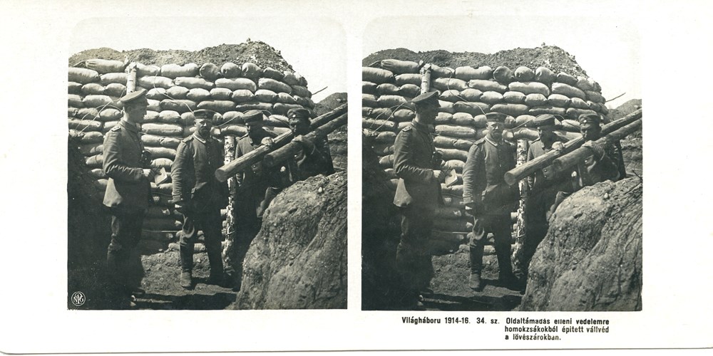 "Oldaltámadás elleni vedelemre homokzsákokból épitett vállvéd a lövészárokban" - A parapet made of sandbags in trenches for protection against side attack