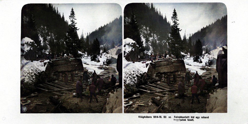 "Felrobbantott hid egy rohanó hegyipatak felett" - An exploded bridge over a rushing stream.