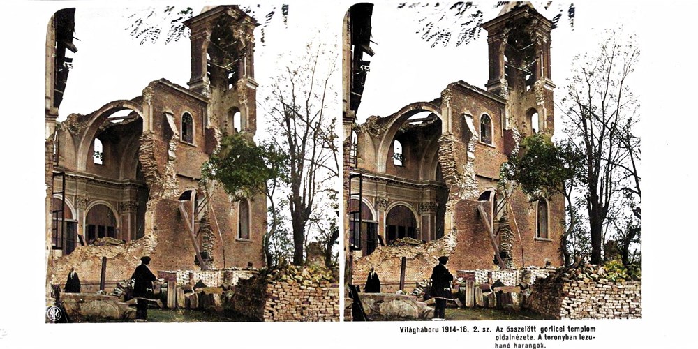 "Az összelött gorlicei templom oldalnezéte. A toronyban lezuhanó harangok" - Side view of the collapsed church in Gorlice. Bells falling in the tower.