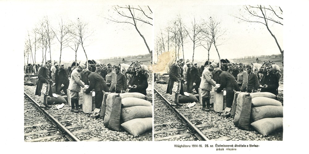 "Élemiszerek átvétele a lövészárkok részére" - Delivery of food for the trenches.
